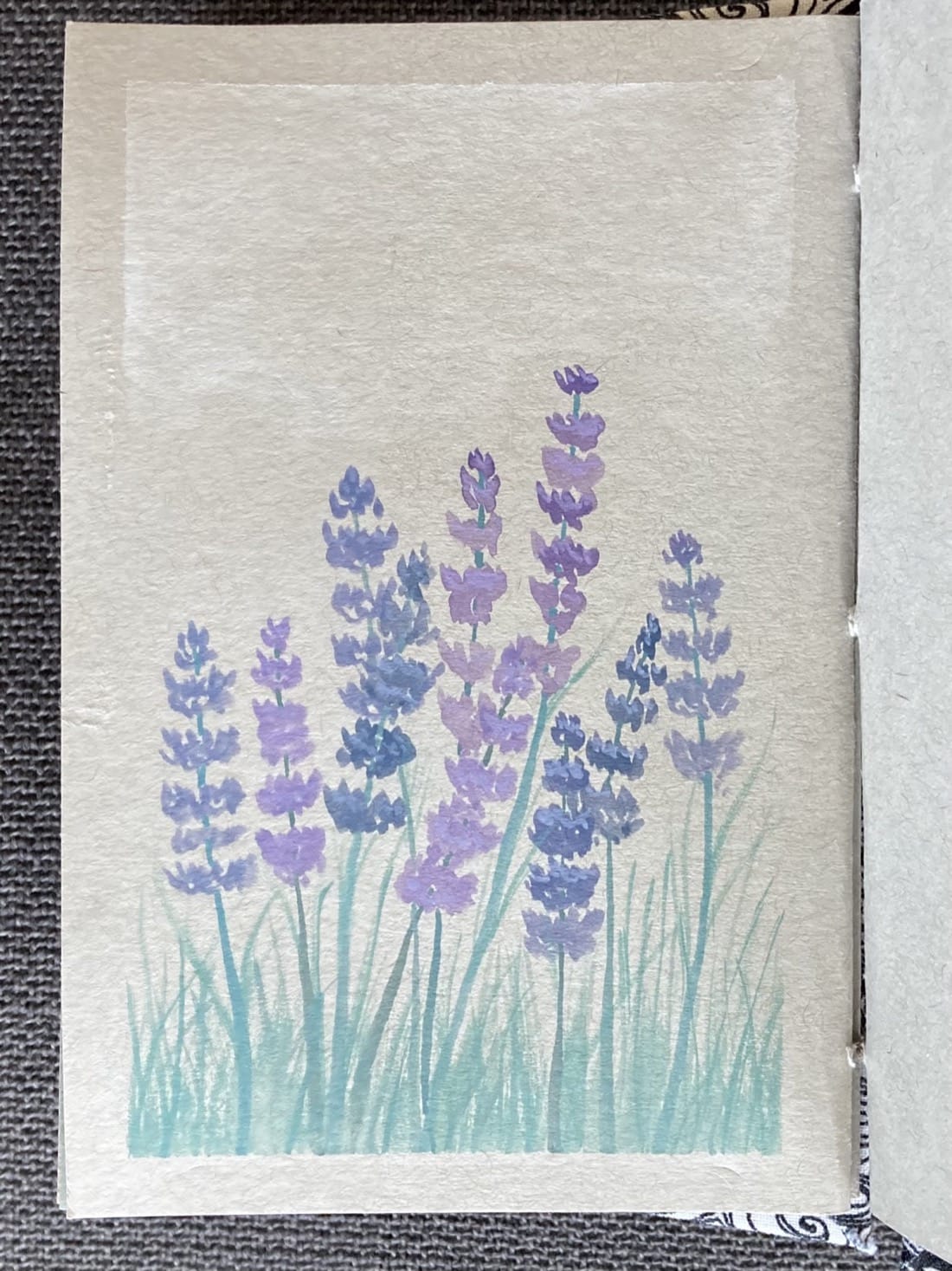 A painting made with Neocolor II water-soluble pastels. A close-up portrait of a clump of lavender. The flower stalks are various shades of dusty purple. Their stems are green with with thin pointy leaves.