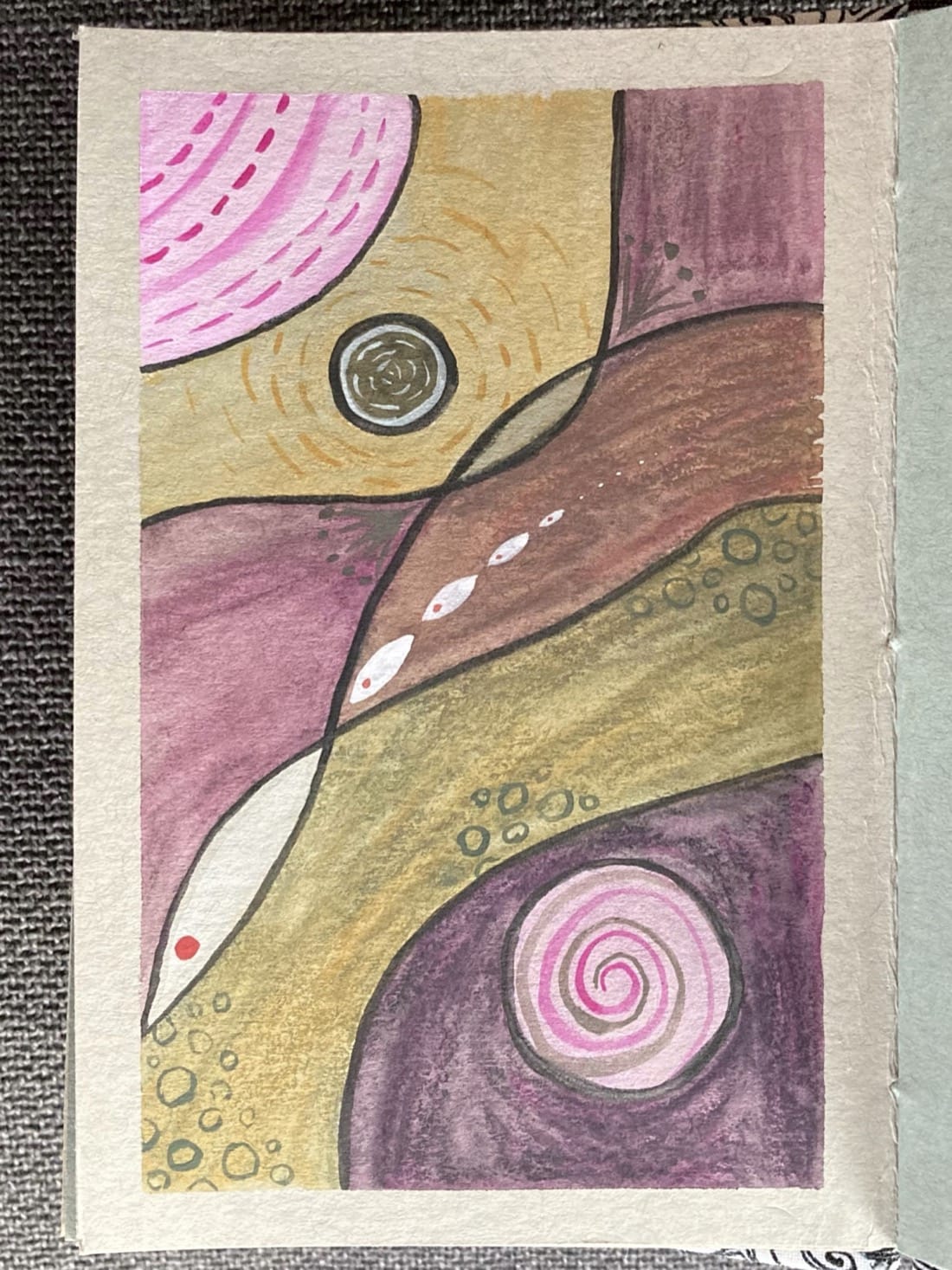 A painting made with Neocolor II water-soluble pastels. Overlapping wavy areas of pink-purple & ocher that start light at the top right corner and get darker as they move to the bottom left of the painting. First is a pale pink section in the top right that’s covered in concentric dotted and solid lines. Next a light ocher section that contains a dark circle that’s surrounded by expanding ocher dashed lines. Within the dark circle are concentric white dashed lines. The third section is muted purple that becomes a reddish brown where it overlaps the next mossy green section. The mossy green section has a few areas that are covered in small dark green circles. Where they intersect there is a series of white lens shapes, each with a red dot resembling an eye. They arch through the overlap. The final section is dark purple with a large light pink-purple circle that contains a bright pink & grey spiral.