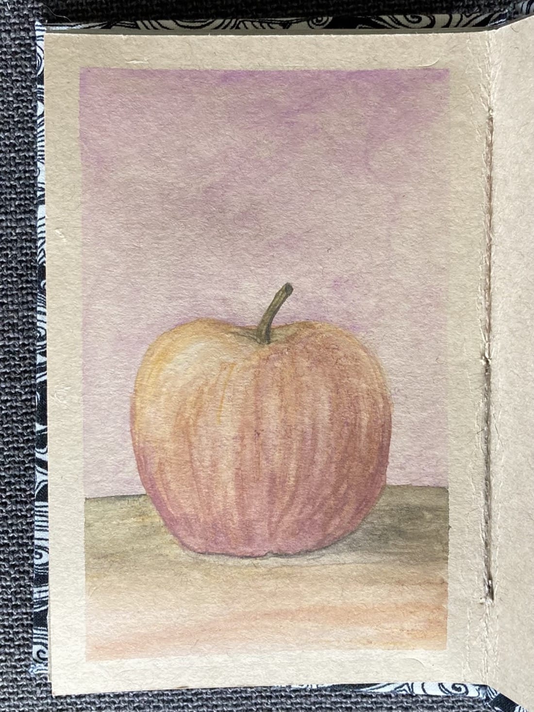 A painting made with Neocolor II water-soluble pastels. A red apple sits on a table in front of a hazy purple background.