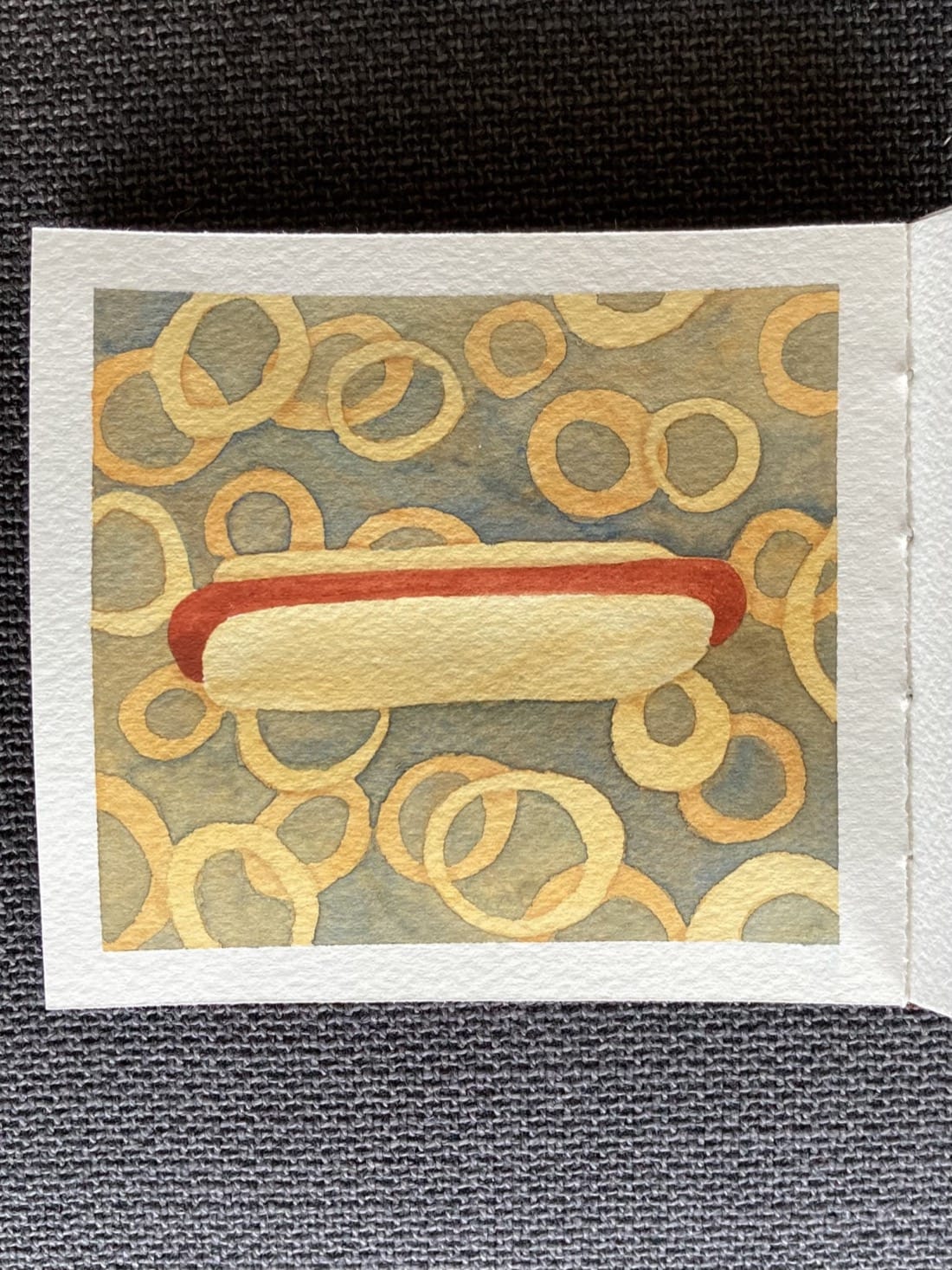 A watercolour painting using the negative space technique. A single hot dog floats before you against a cascade of onion rings on a mottled grey-blue background.