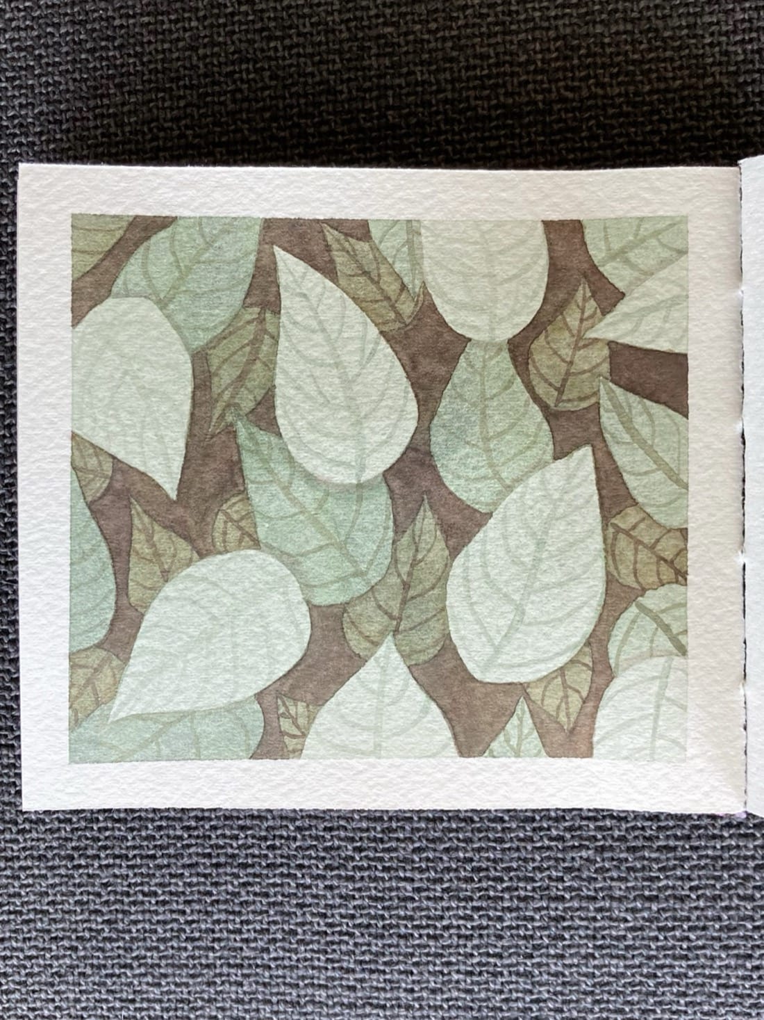 A watercolour painting using the negative space technique. A smattering of green leaves in shades of light, mid, and dark green. They are pointed at their tips and rounded at their bases. They’re layered over a chocolate brown background.