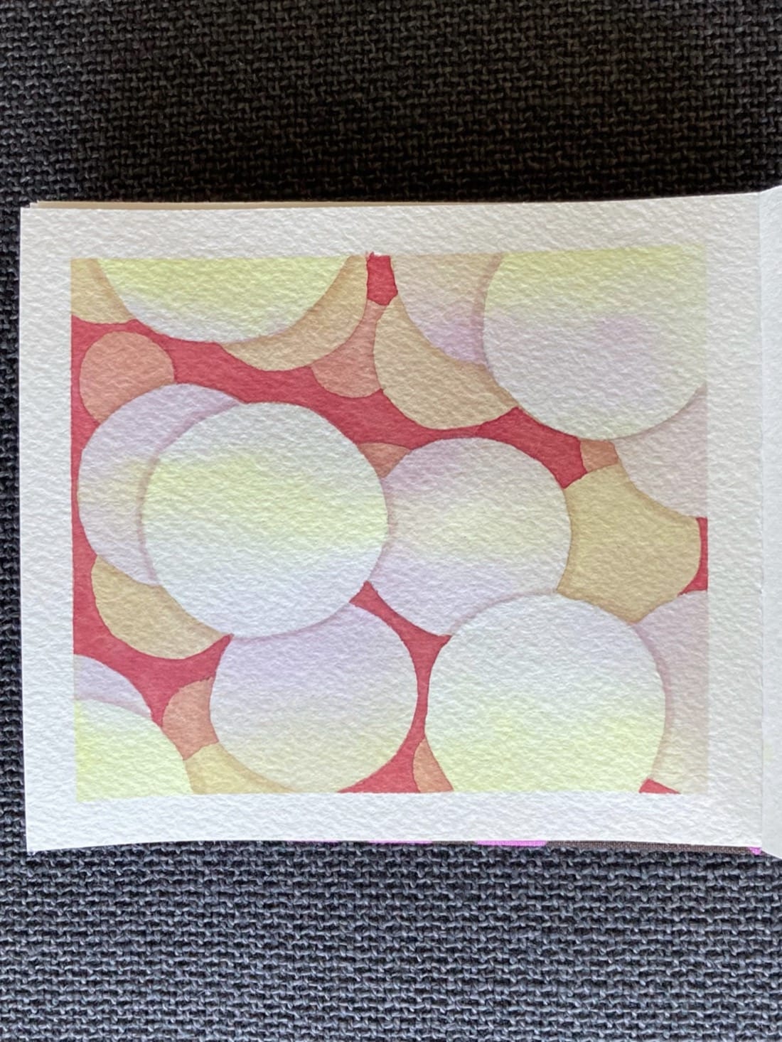 A watercolour painting using the negative space technique. Pearly white spheres with pale pink and yellow streaks are piled on a deep coral red background.
