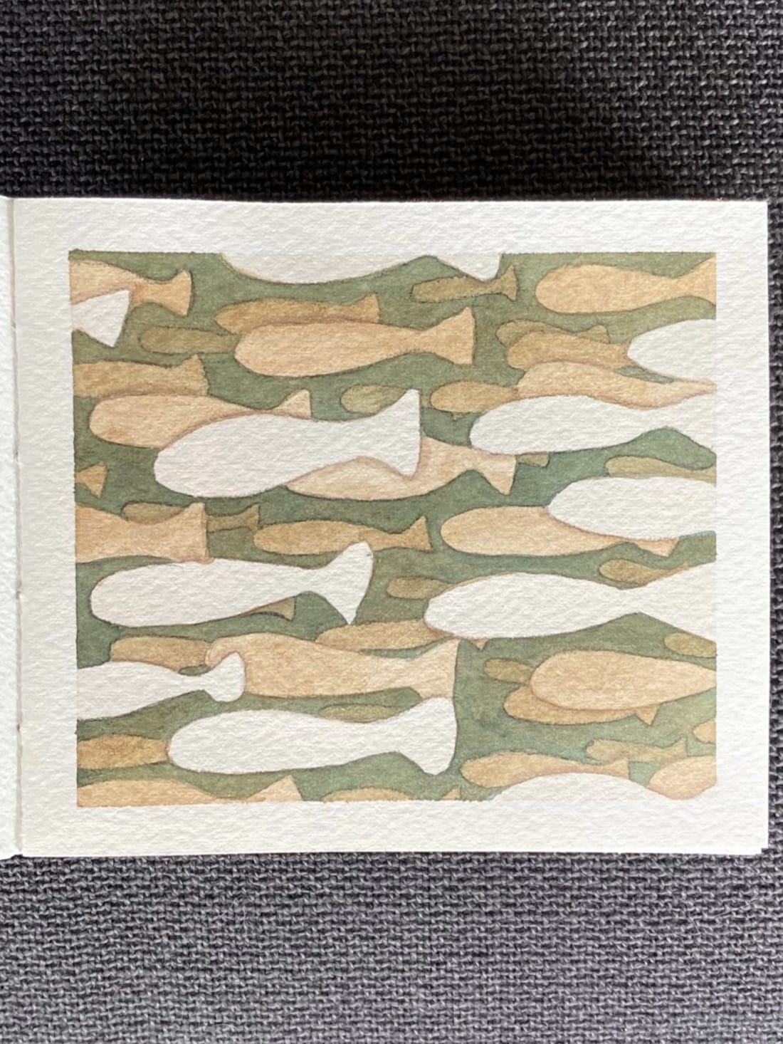 A watercolour painting using the negative space technique. A school of sparkly pale fish swim, right to left, through murky green water.