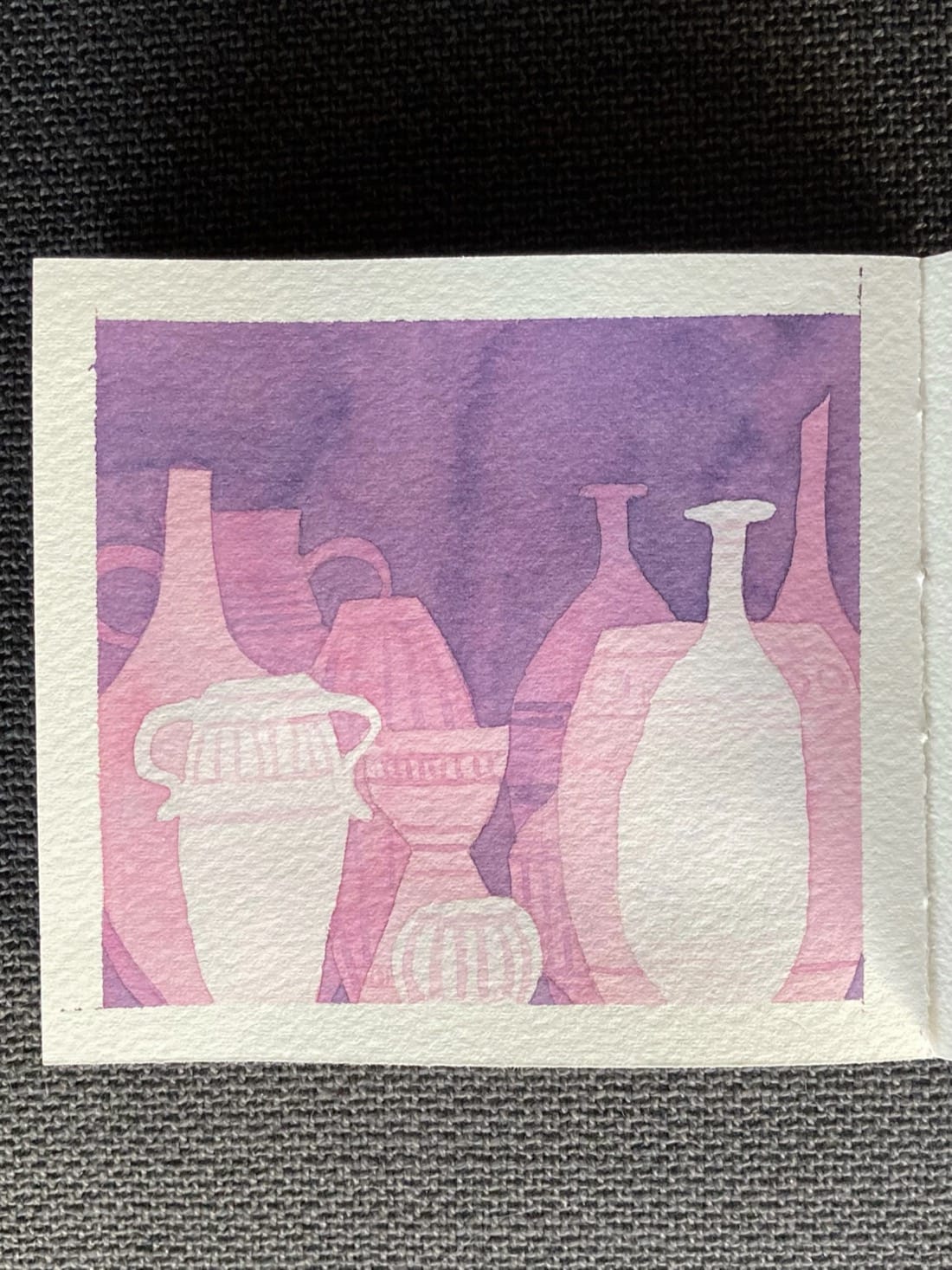 A watercolour painting using the negative space technique. A collection of vases and pots of various sizes and shapes. The vases and pots in the foreground are pale pink with light pink markings. Pots and vases further back are deeper and deeper pink. They are in front of a mottled purple background.