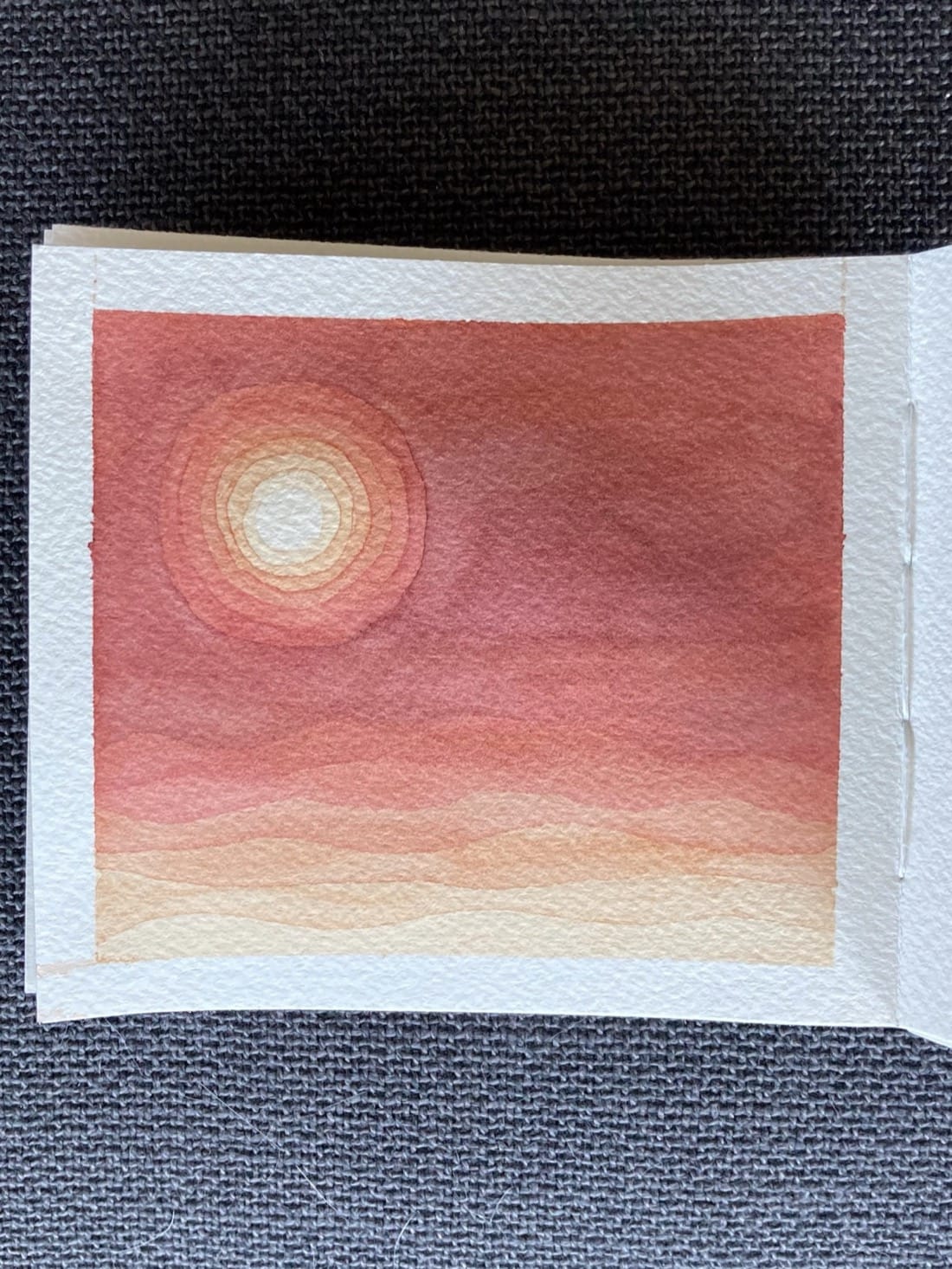 A watercolour painting using the negative space technique. A bright, hot sun hangs low in a blistering red sky over a desert full of dunes stretching off into the distance.