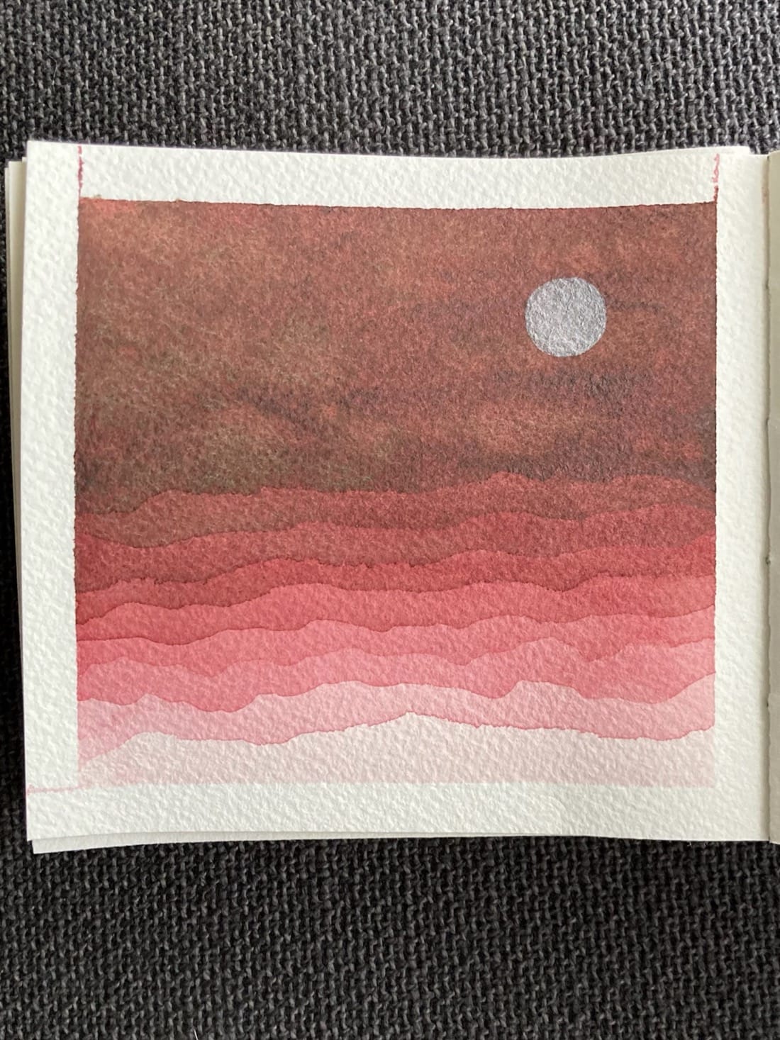 A watercolour painting using the negative space technique. Rows of mountains, from pale pink to deep muddy burgundy, stretch off into the distance below a turbulent reddish-brown sky. In the sky hangs a silvery full moon.