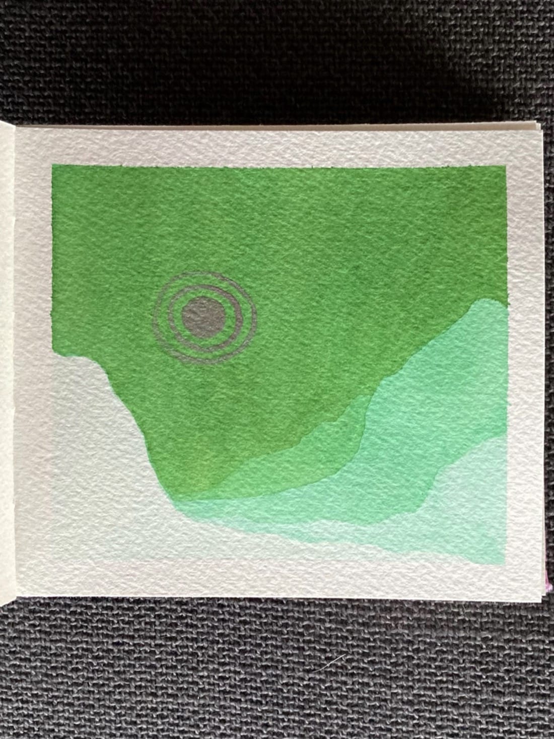 A watercolour painting using the negative space technique. Green mountain valley against a bright green sky. Above the valley hangs a strange, double-ringed celestial body.