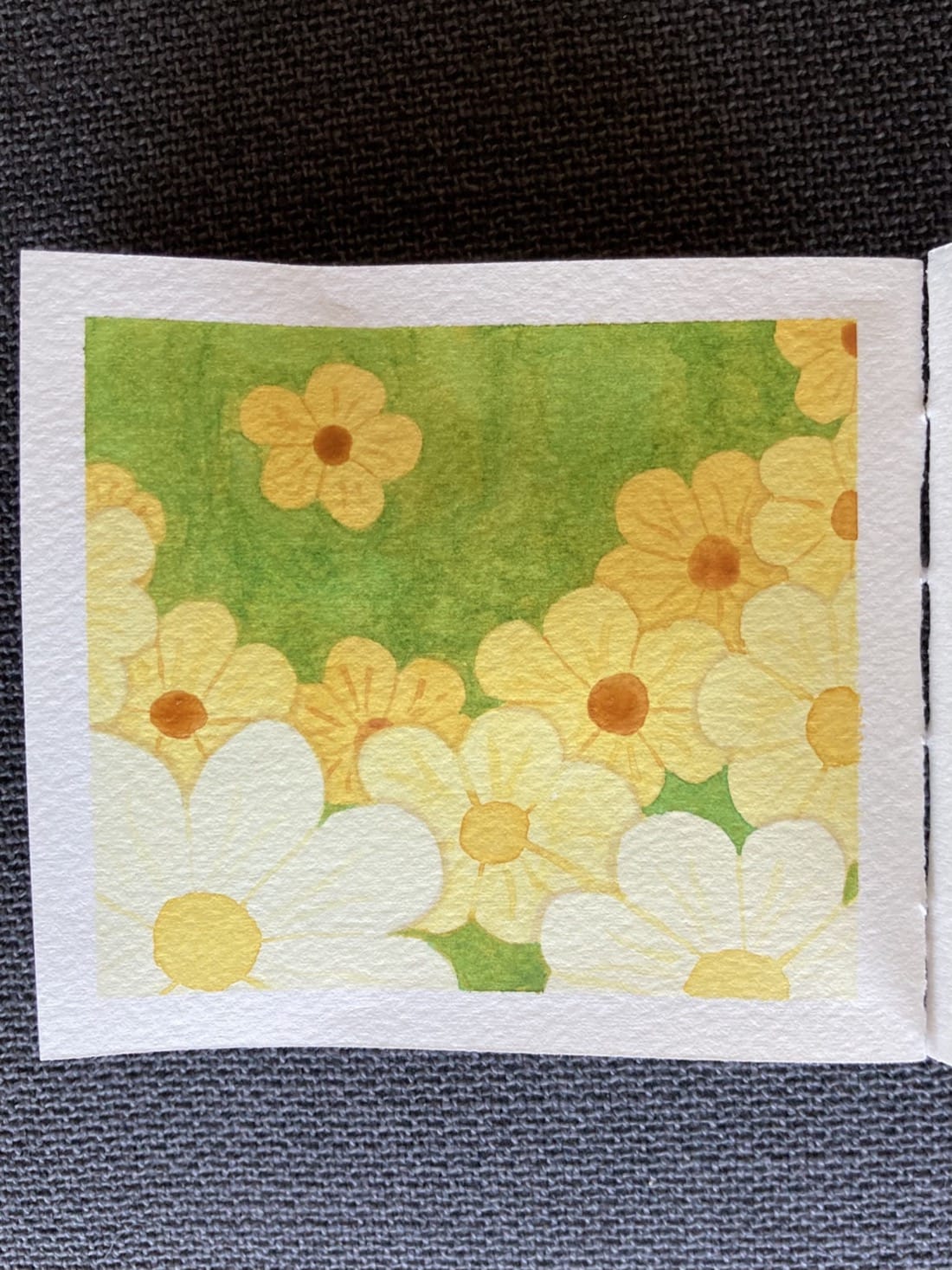 A watercolour painting using the negative space technique. Yellow daisies cascade down a yellow-green background.