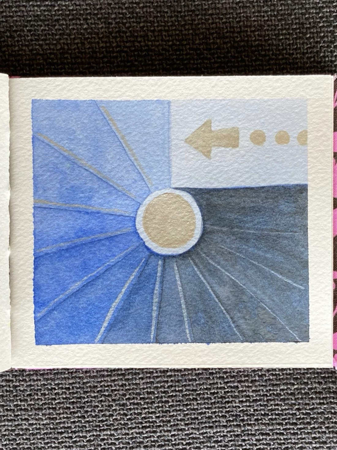 A watercolour painting using the negative space technique. A blue spiral staircase viewed from above. In the top right corner is the top landing. The floor is pale blue and on it several sparkly dots followed by a large arrow pointing to the stairs have been painted on the floor. The stairs wind counter-clockwise around a pale blue pillar with a sparkling core. Each step has a reflective stripe along its edge. As the stairs descend into the darkness of the next floor, the reflective stripes remain all that’s visible.