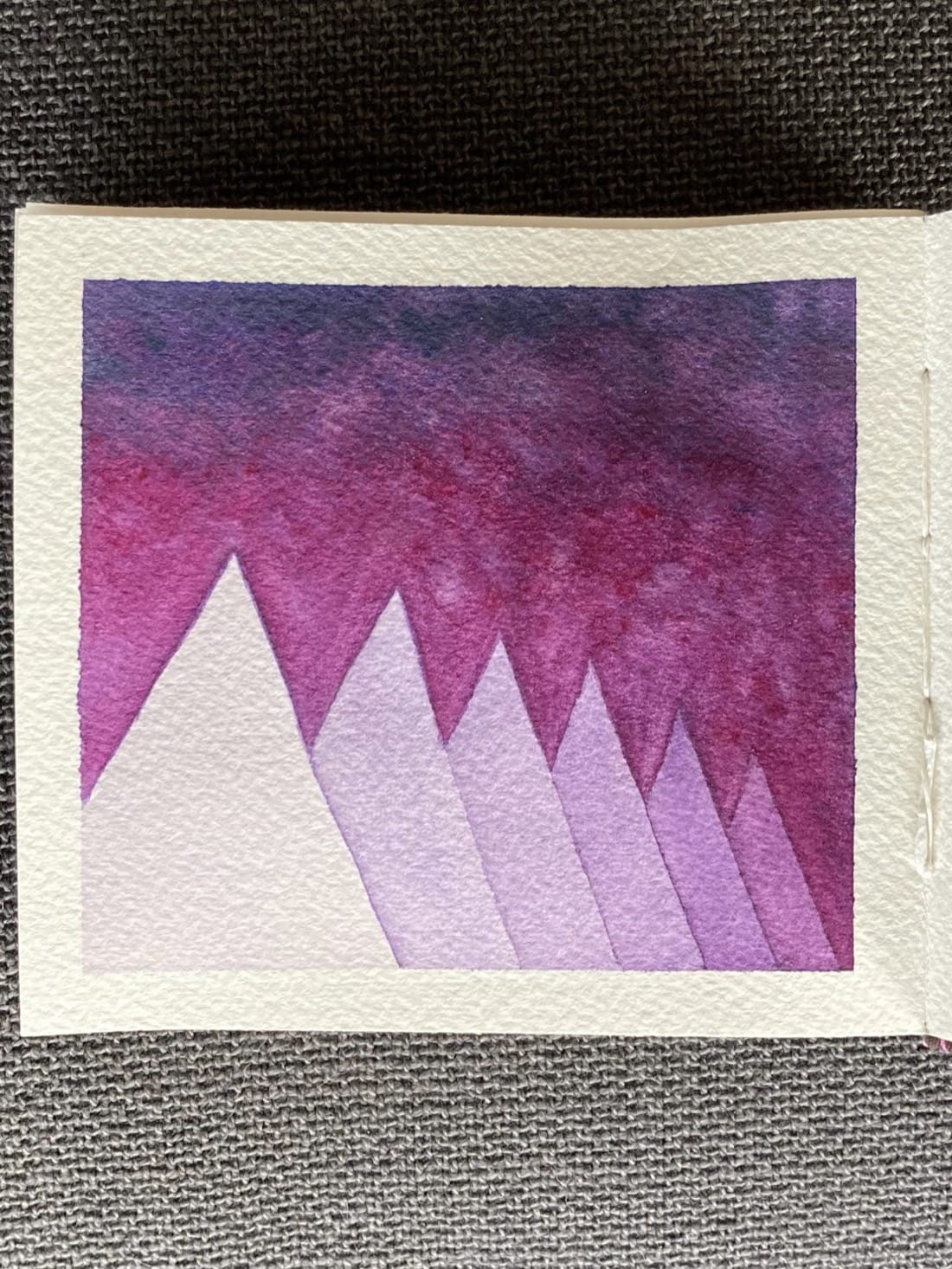 An abstract watercolour painting using the negative space technique. A range of pale violet, triangular mountains stretch off into the distance against a deep purple & magenta gradient sky.