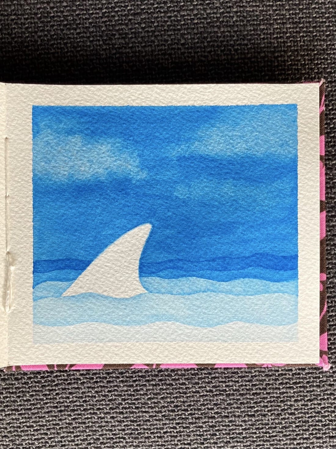 An watercolour painting using the negative space technique. A large shark fin breaks the choppy surface of the ocean. A few puffy clouds float in the bright blue sky above.