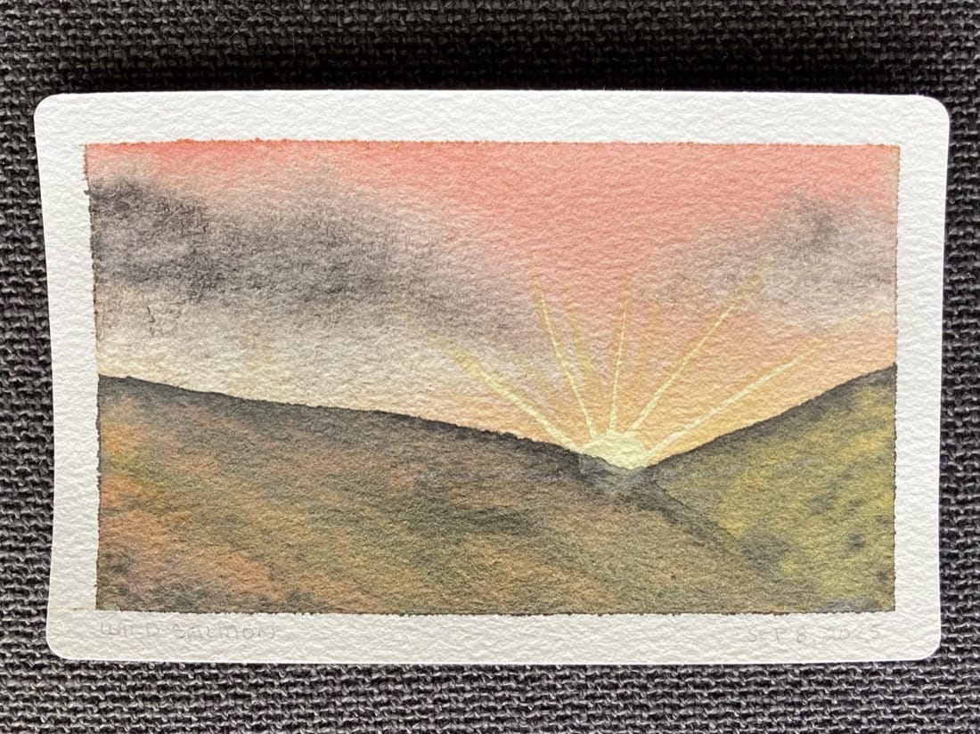 A watercolour painting of a sunset. The sky is a red-orange gradient. Two dark clouds hang in the sky above the setting sun. The sun’s rays stretch into the sky as it sets behind a pair of rolling hills.