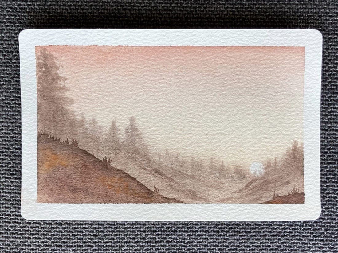 A watercolour landscape painting. The sun, small in the hazy orange sky, sets behind the trees in a shallow valley. The gently sloping hills of the valley are dotted with pine trees and slightly obscured by the haze. In the foreground, the closest hills are lightly covered with grassy vegetation.