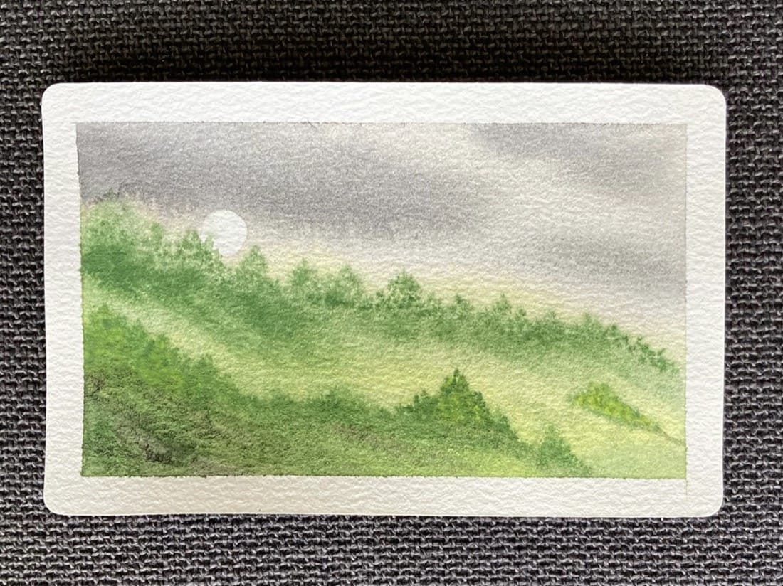 A watercolour landscape painting. The full moon rises behind rolling hills. The hills are covered with leafy trees and pale green-yellow foliage. The sky above is grey and cloudy.