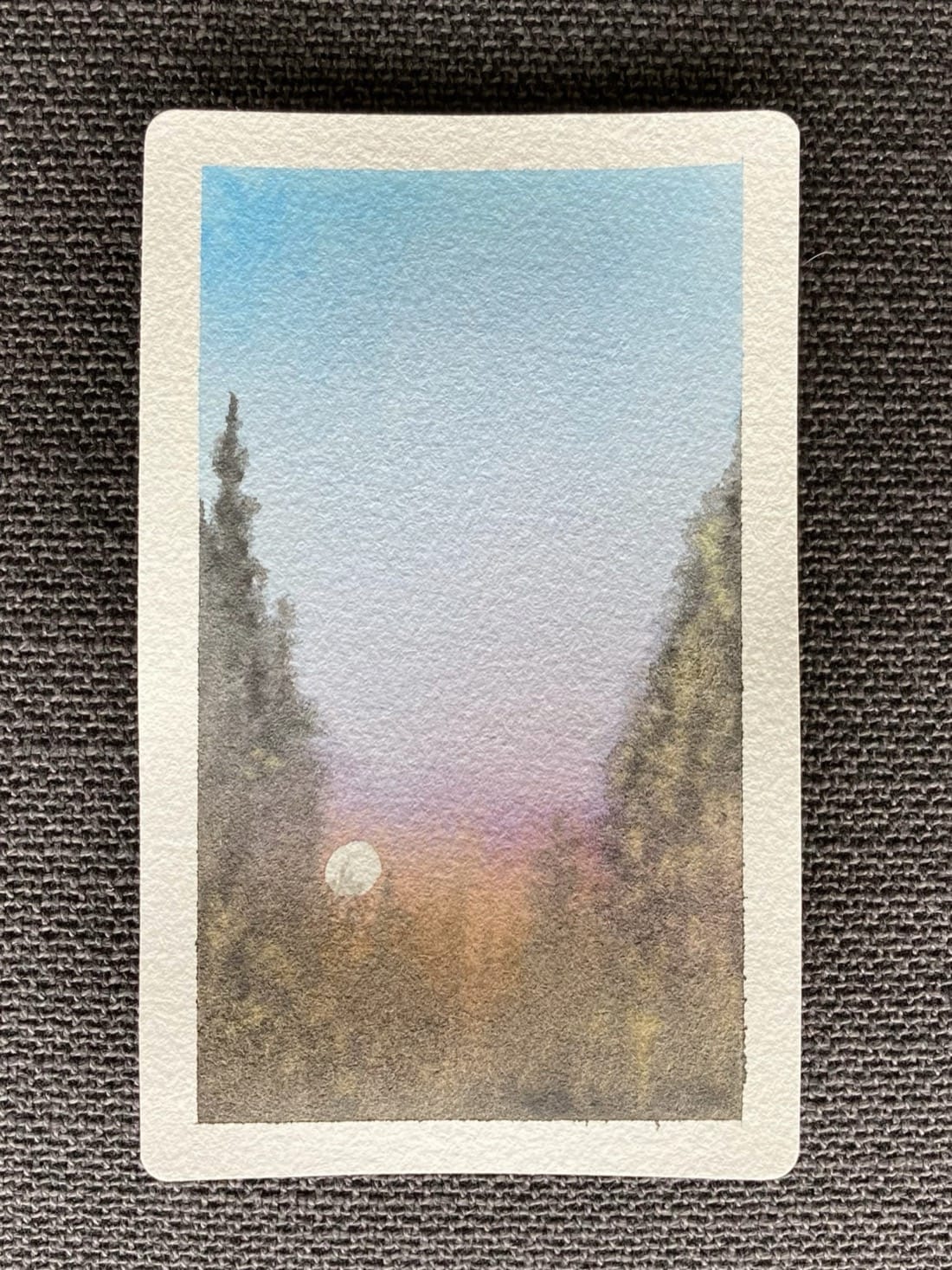 A watercolour landscape painting in portrait orientation. The sun, low in the sky, sets behind a forest of conifers. On the left and right edges of the painting are tall trees, while those in the middle are shorter or further away. Near the horizon, the sky is orange and reddish-purple, changing to a cerulean blue at the top of the painting.
