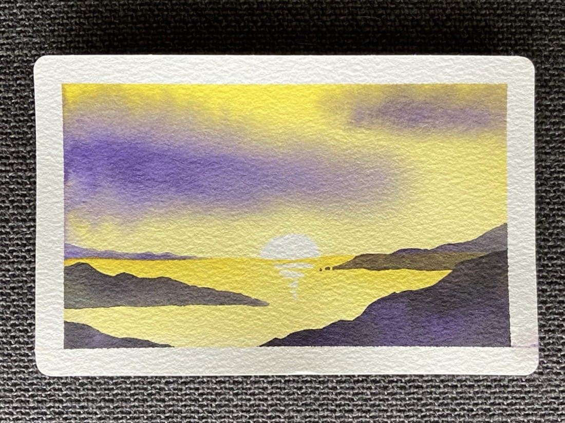 A landscape watercolour painting. The sun sets beyond the ocean’s horizon, casting a golden glow into the sky that’s reflected in the water. Fingers of land reach into the ocean from either side of the painting, silhouetted against the water and sky. Above, large diffuse clouds hang in the air.