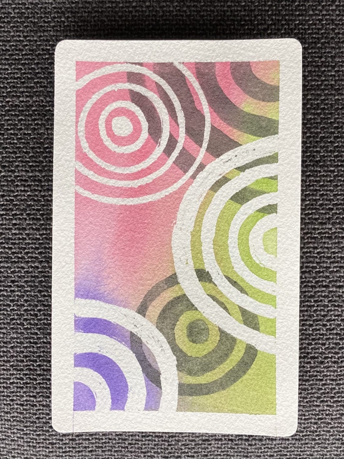 An abstract watercolour painting. Several sets of concentric rings in black and white against a background of fluid pink, purple, and green. Perhaps they’re ripples on the surface of water.