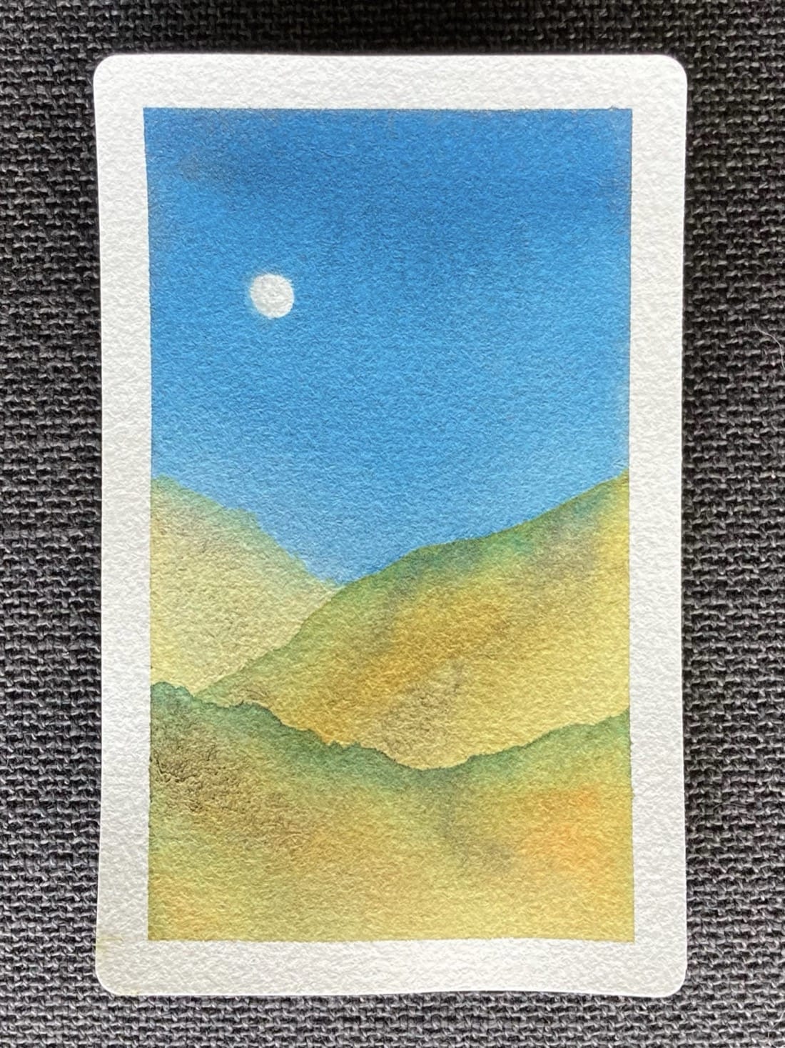 A landscape watercolour painting. The moon is nearly full in a sparkling deep blue sky. Below, are three rolling hills.