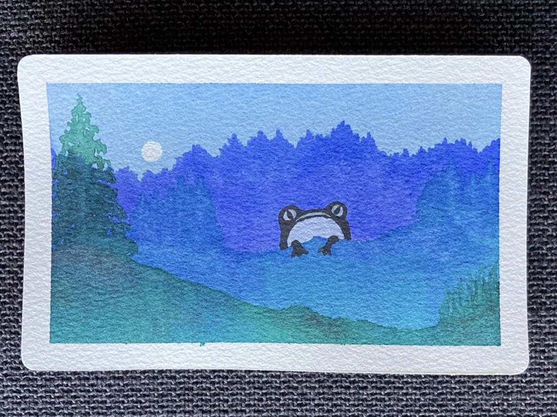 A watercolour landscape painting. A massive black and white frog climbs over a hill in a forest in the gap between two clusters of trees. It is nearly as tall as the trees and stares straight ahead with its large eyes.