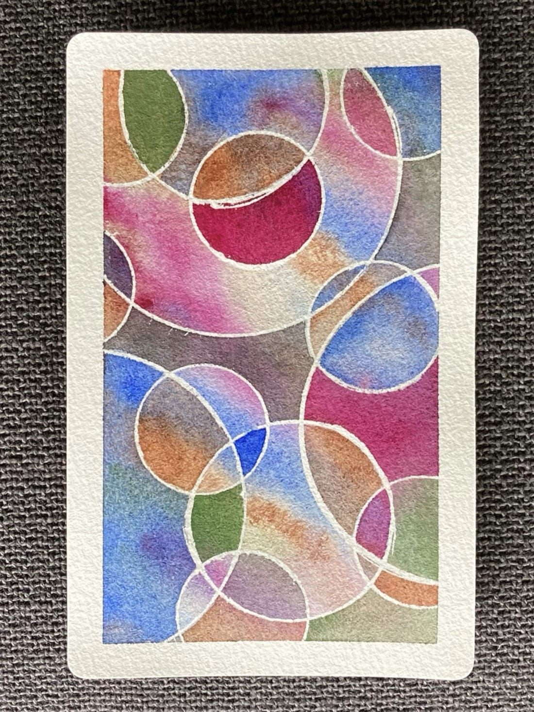 An abstract watercolour painting. Overlapping circles of varying sizes with white outlines are placed on a background of swirling blue, green, magenta, and deep orange. Where the circles overlap, they are sometimes tinted with another colour.