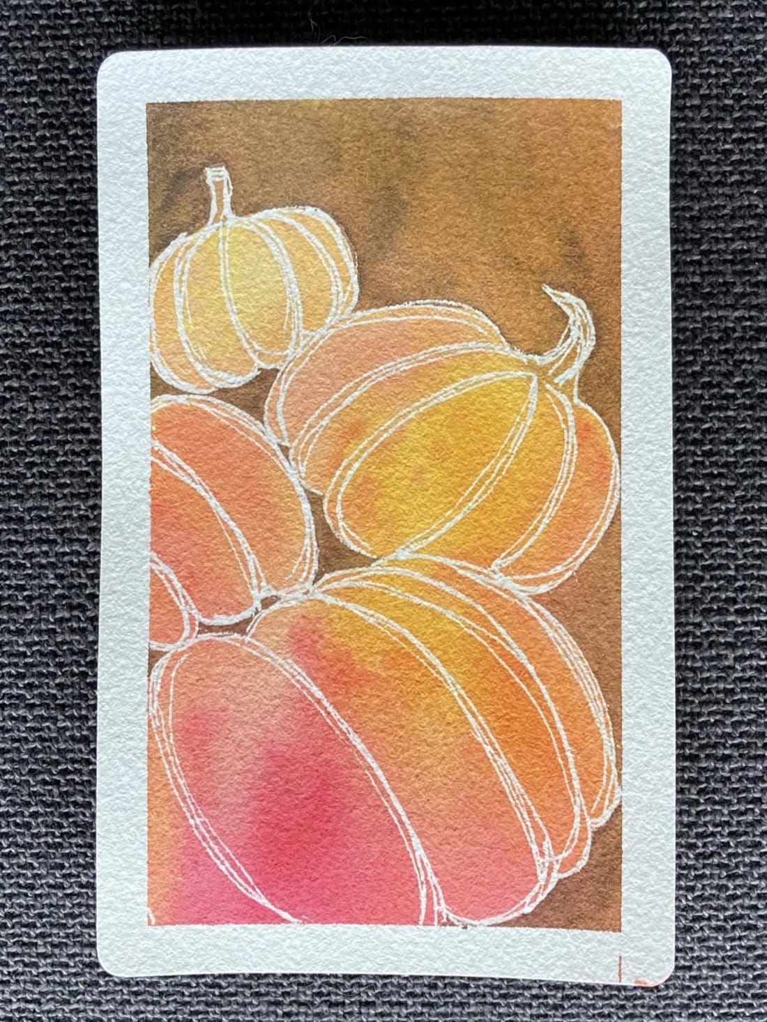 A watercolour painting of a stack of pumpkins against a mottled brown background. The pumpkins are yellow, orange, and red.