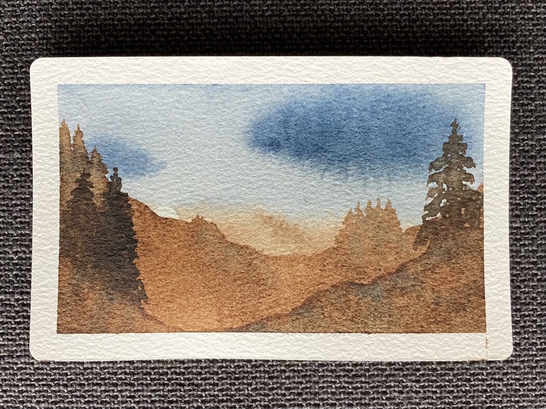 A watercolour landscape painting. The sun is peeking up behind brown mountain that’s dotted with clusters of pine trees. The sky is pale blue with a couple of dark clouds. In the foreground is another hill that dips in the middle, with a cluster of pine trees on the left and a single pine tree on the right.