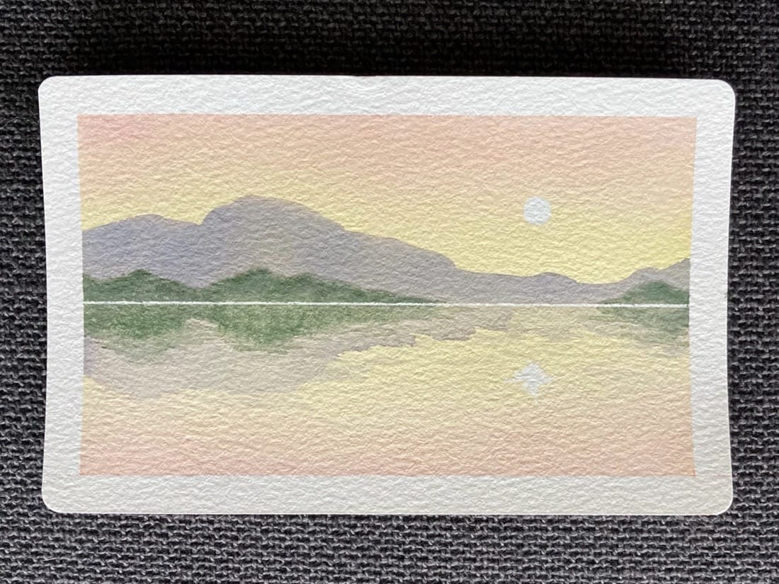 A watercolour landscape painting. The sun sets behind dusty blue-grey mountains. The sky is glowing golden yellow and orange. The mountains, the smaller green hills in front of them, and the sun are reflected in the lake.