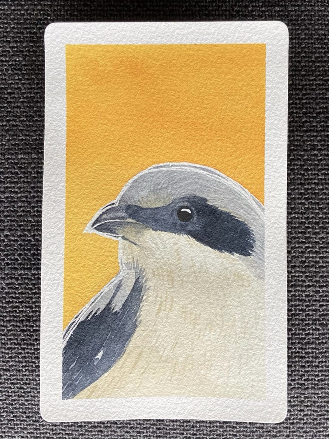 A portrait of a Loggerhead Shrike. It has a white body and throat, black beak, grey and black wings. The top of its head is grey. A black stripe runs across each side of its head across its eyes.