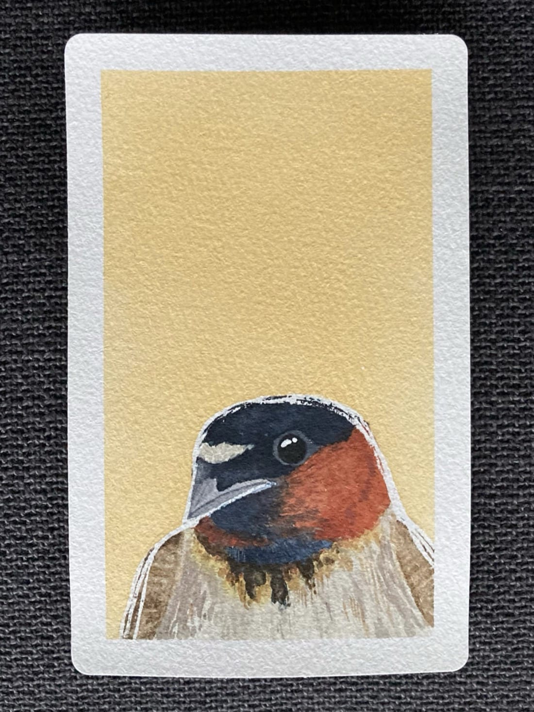 A portrait of a Cliff Swallow on a warm yellow background. Its head is deep blue with red cheeks and its beak is grey. Its eyes are round, black, and outlined with grey. Its body is tan with brown streaks. Its wings are mottled brown.The swallow is outlined with sketchy white lines.