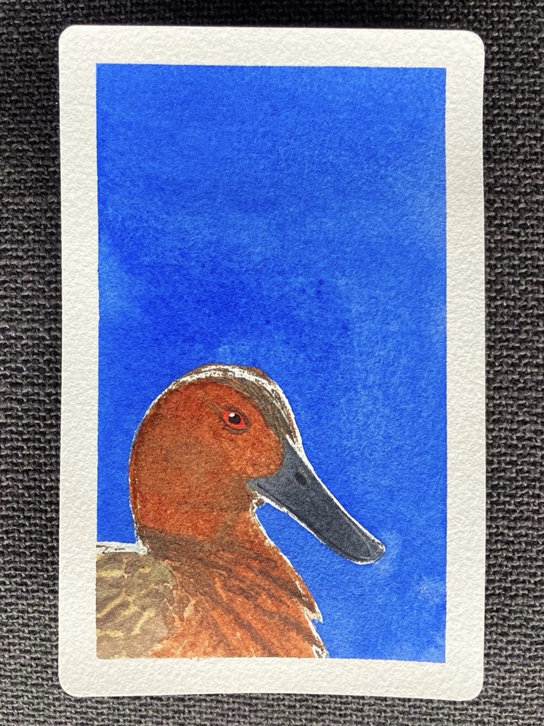A portrait of a Cinnamon Teal on a saturated blue background. Its body, neck, and head are burnt orange. On top of its head is a dark stripe of feathers. Its wings are brown and pale orange to yellow. It has bright red oval eyes with small black pupils and a long black bill. The teal is outlined with sketchy white lines.