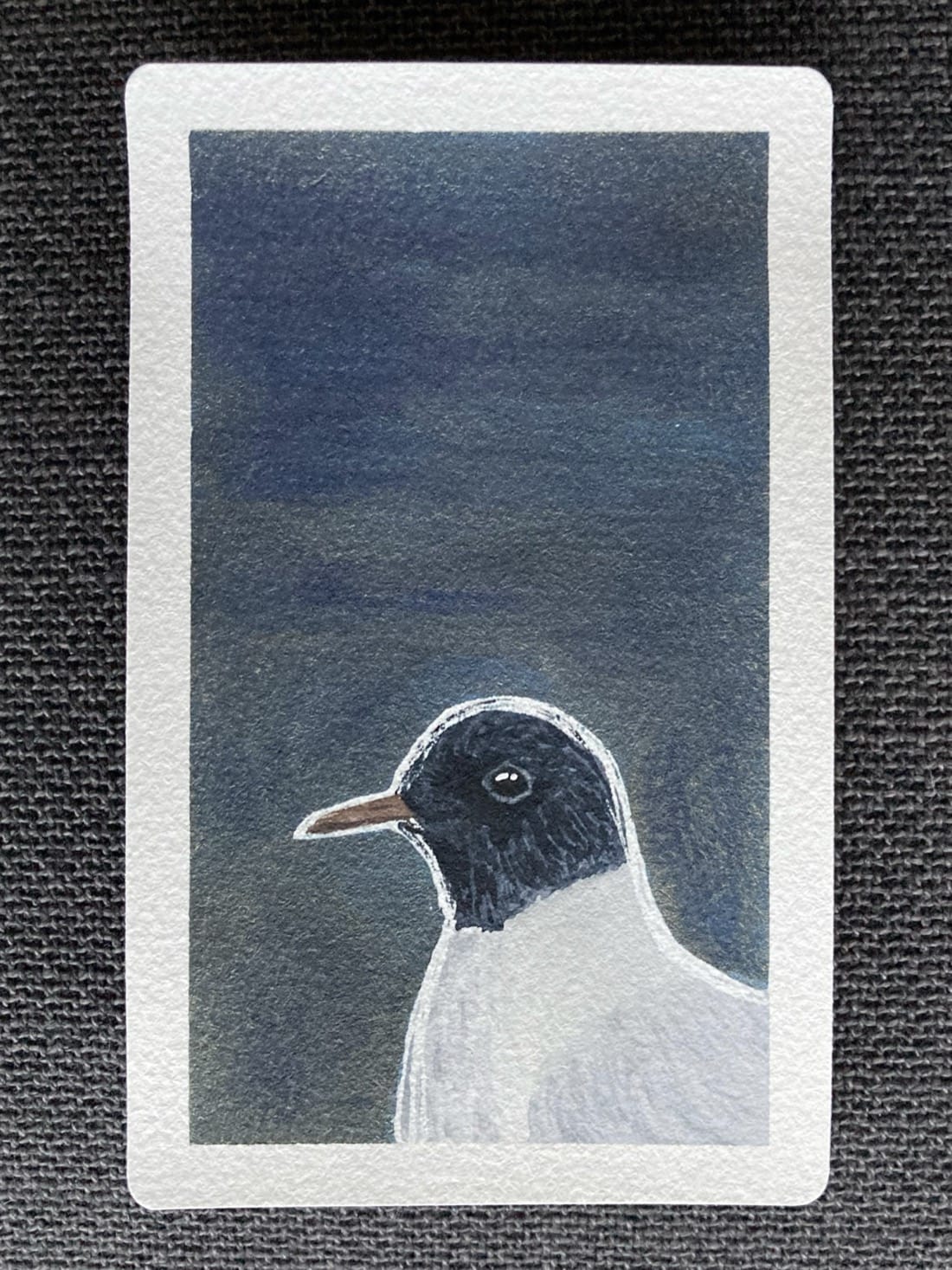 A portrait of a Little Gull on a sparkling dark blue background. Its body is white and its wings are grey. Its head is black with a small brown beak. It has large black eyes. The gull is outlined with sketchy white lines.