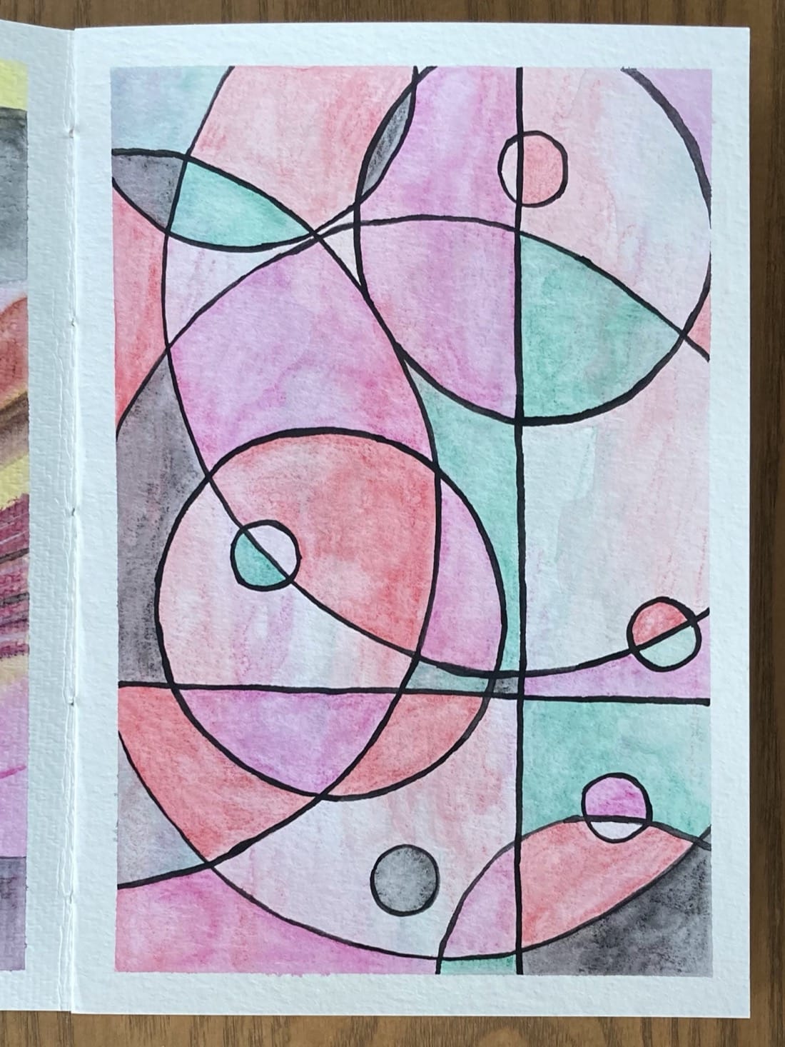 An abstract painting of overlapping circles of various sizes, outlined in black. Each discrete section is filled with red, purple, green, or grey. Some of the sections are filled with a light blend of multiple colours. The piece is divided horizontally and vertically by a pair of straight black lines.