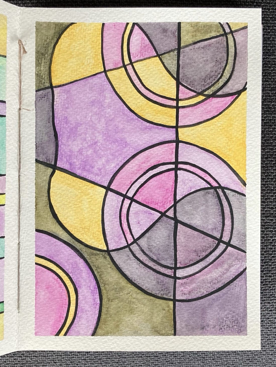 An abstract painting made with Neocolor II water pastels in shades of pink, purple, and yellow. The page is divided by one vertical line and two angles horizontal lines. Where the horizontal and vertical lines meet are concentric circles with alternating colours in their sections. A wavy line snakes through the page with the area on the outside of the organic shape it creates a shade darker than the area without the shape.