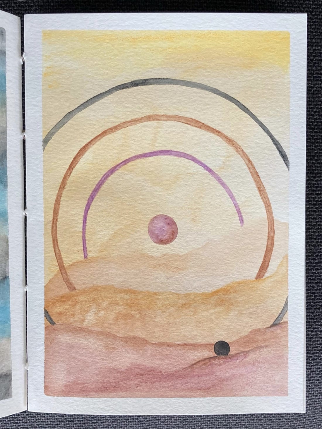 Again purple orb floats in the yellow sky above a dry mountainous landscape. Around it are three rings — purple, brown, and black — each ring reaching the top of one of the mountain ranges below. On a hill, in the foreground, sits a small black orb; the only witness to this arrival.