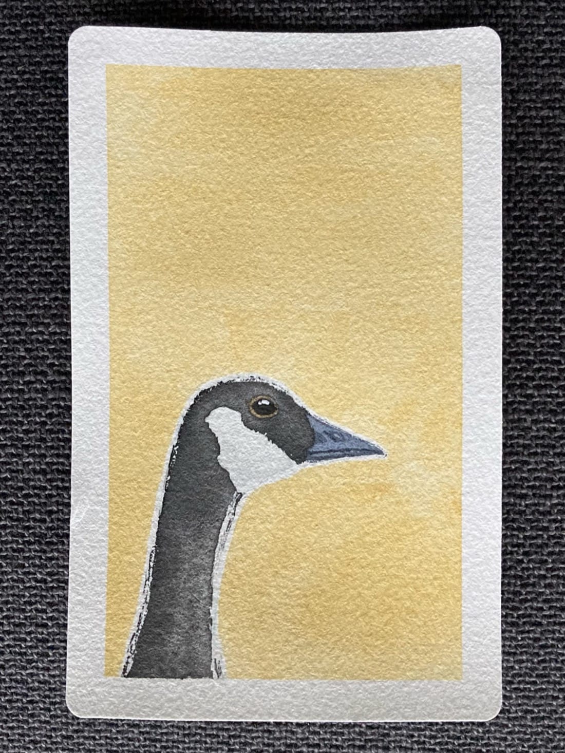 A portrait of a Canada Goose on a buttery yellow background. Its long neck and head are black, save for a white throat patch that extends up the sides of the goose’s face. It has a grey beak and large black eyes rimmed with brown. The goose is outlined with sketchy white lines.