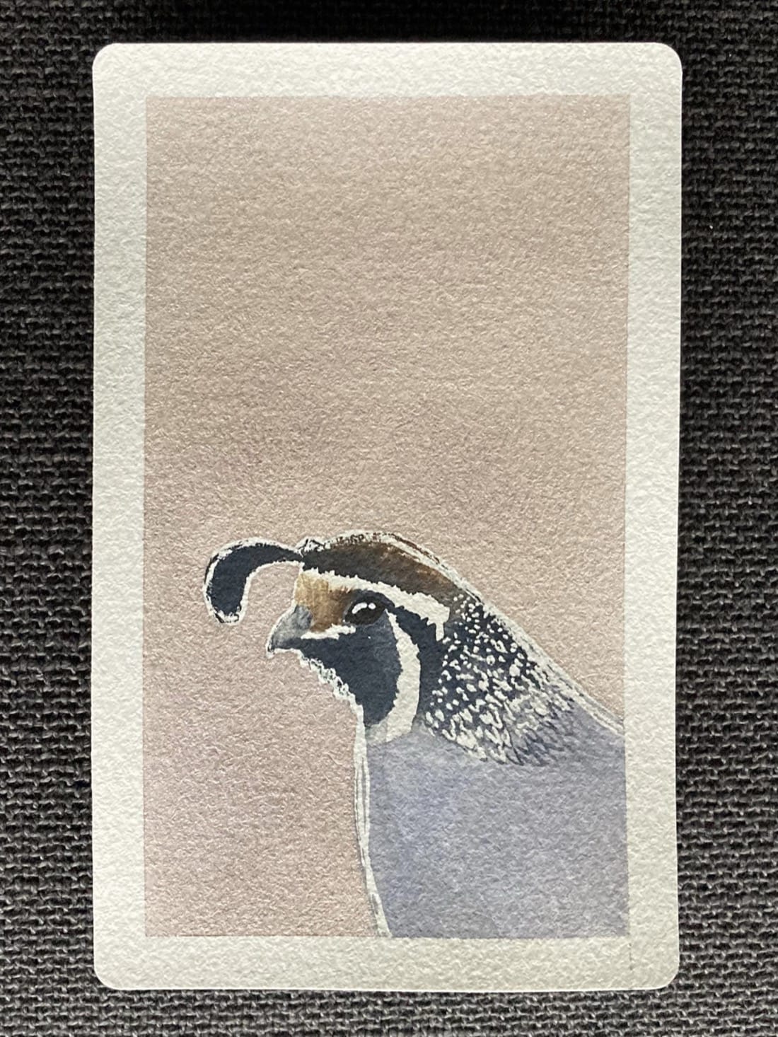 A portrait of a California Quail on a sparkling pale brown background. Its body is covered in soft grey feathers. Its neck is black with a white band that sweeps up over its cheeks to meet its eyes. Another white band runs around the top of its head over its eyes. Down the back of its neck, fading into the grey feathers of its body, are black and white spotted feathers. It has curved dark grey beak large black eyes. A black plume droops forward from the top of the quail’s head. The quail is outlined with sketchy white lines.