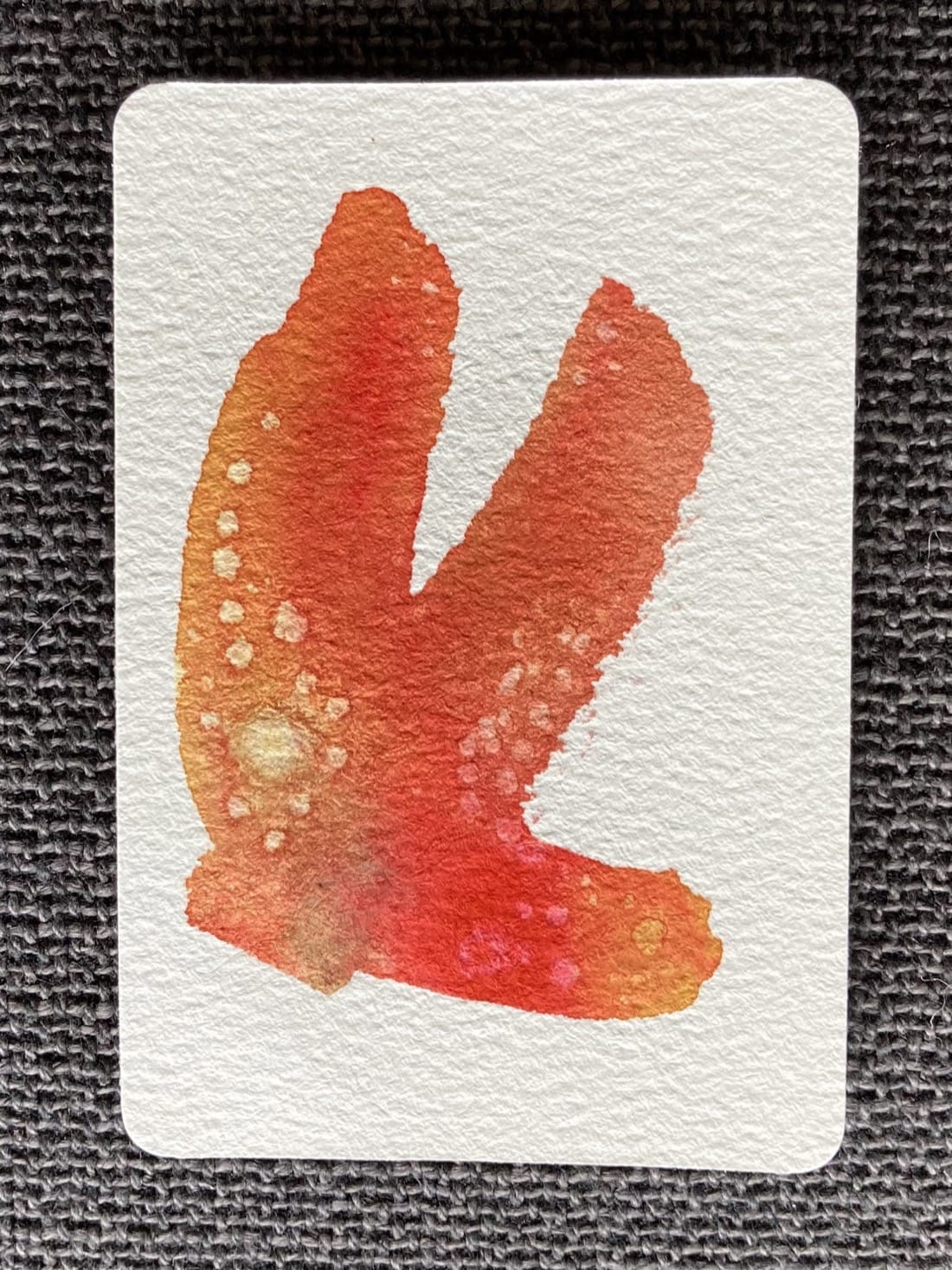 A small abstract watercolour painting. A wide arc and streak of red, gold, and brown dotted with lighter spots along some of their edges.
