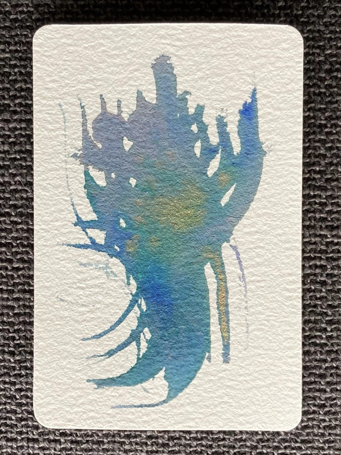 A small abstract watercolour painting. A cluster of curving streaks of deep blue, green, gold, and pinkish-grey.