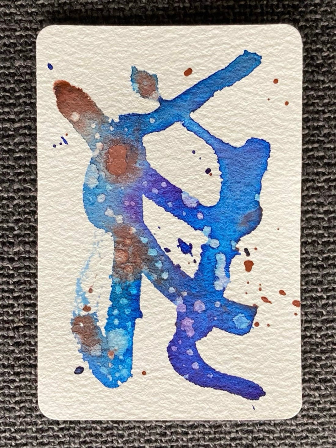 A small abstract watercolour painting. Vertical and diagonal lines in blue, purple, and rusty red, some dotted with light spots. The background is splattered with those same colours. It makes me think of two people dancing at a party.