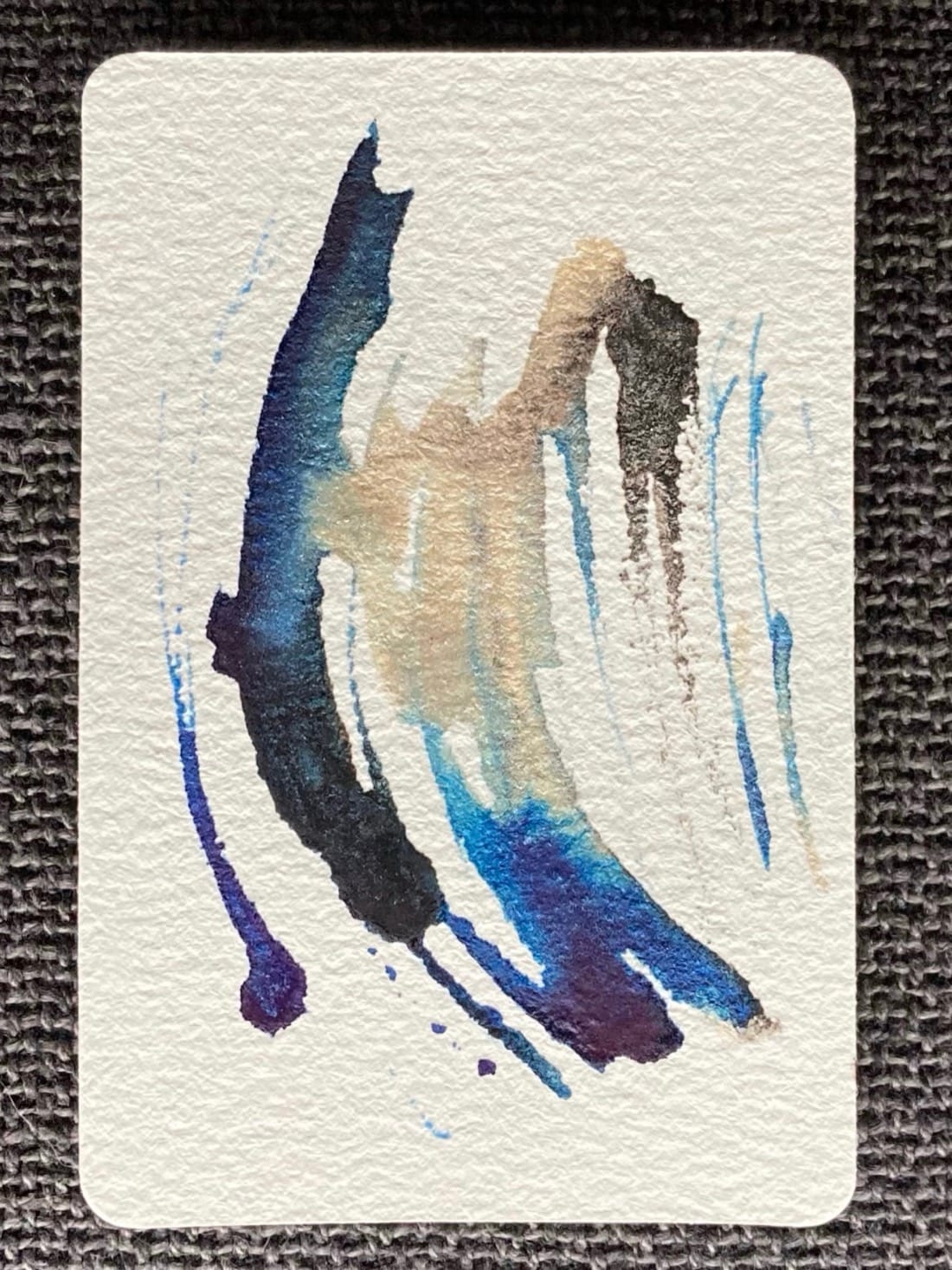A small abstract watercolour painting. Arcs of deep blue, black, and sparkling champagne sweep up the paper. Where they touch they bleed into one another.
