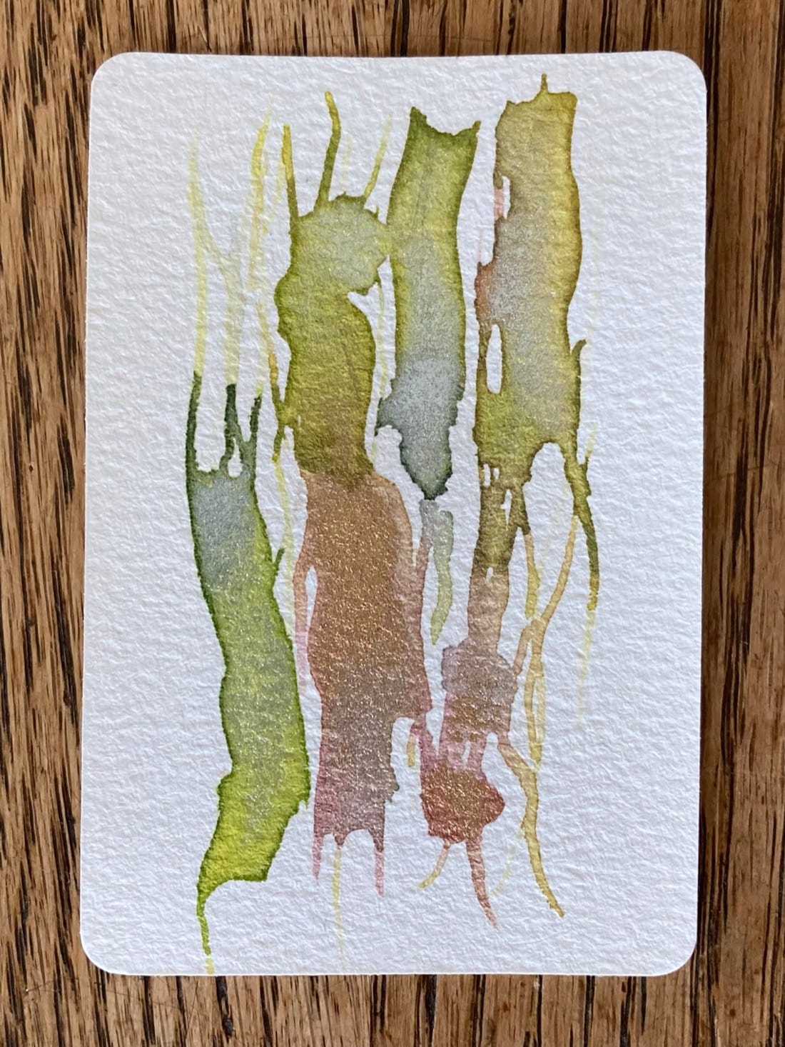 A small abstract watercolour painting. Thick and thin shaggy vertical stripes in a mix of yellow-green, rose gold, and gunmetal grey.